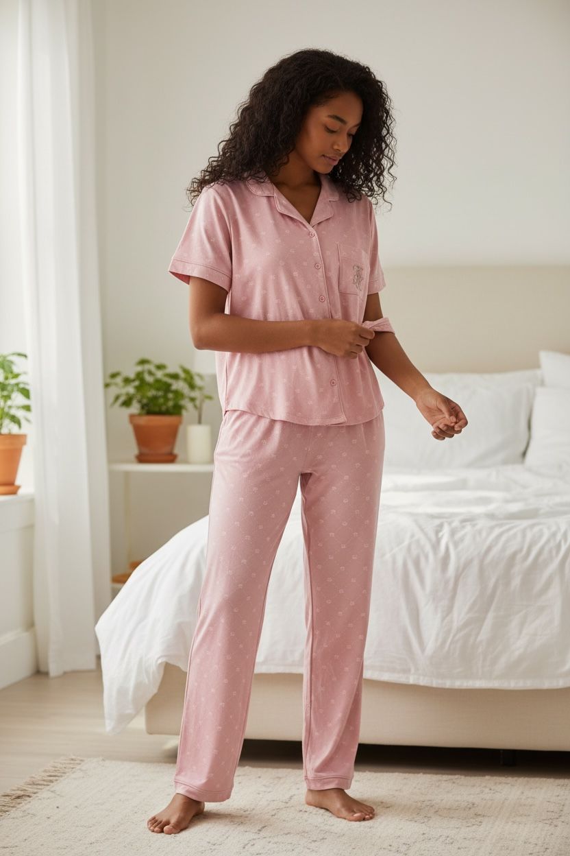 * Terciopelo (Velour): Aunque los conjuntos de terciopelo son más famosos como chándales (buzos), la marca también tiene pijamas cortos y largos en este material, a menudo con el logo de pedrería o cristales en la parte trasera del pantalón o en la polera.