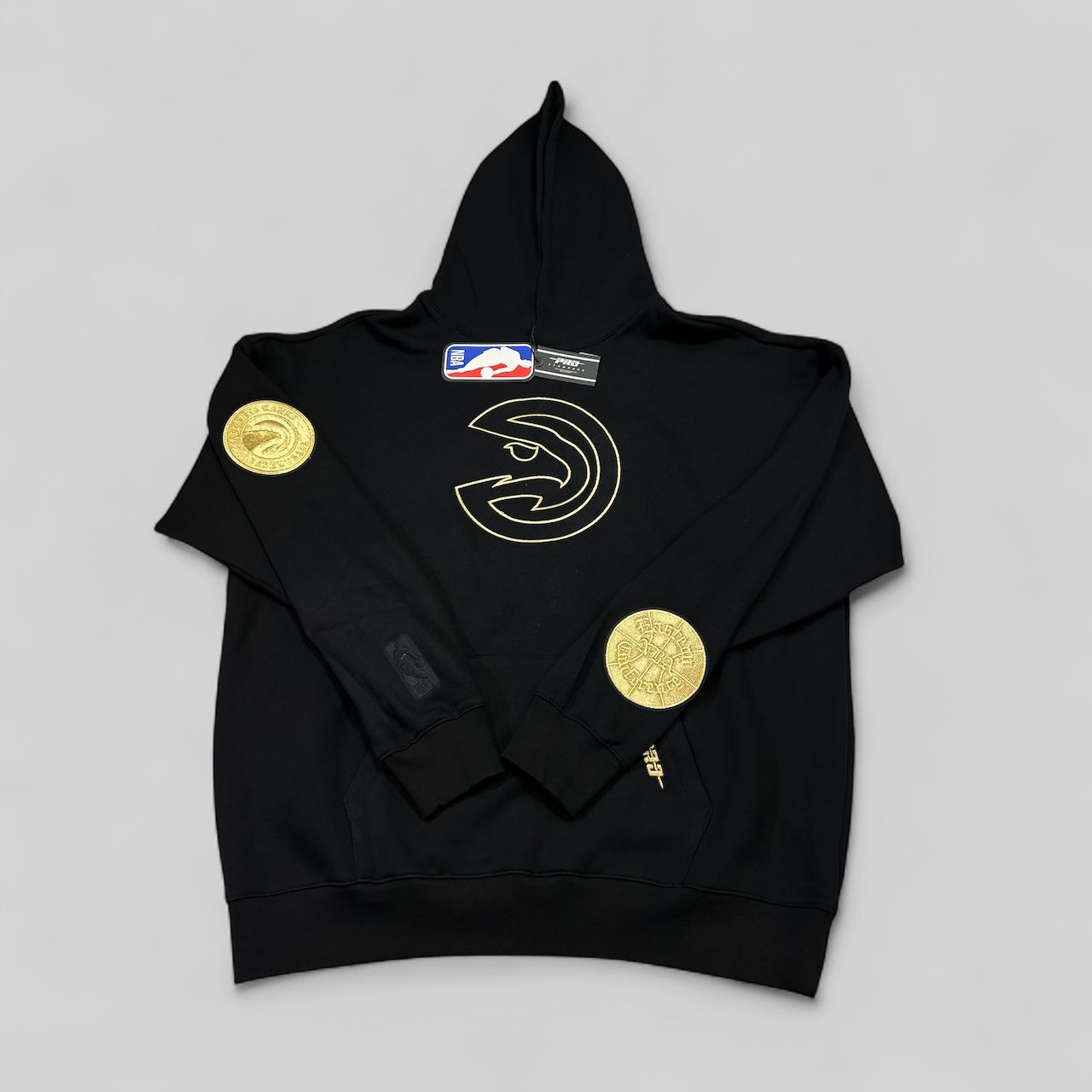 Luce un estilo único con este exclusivo polerón NBA de los Atlanta Hawks en color negro con detalles dorados. Su diseño elegante resalta con el logo bordado en el pecho, parches tribales en ambas mangas y detalles adicionales que lo convierten en una prenda de edición especial. Ideal para fanáticos del baloncesto que buscan una prenda de alto impacto visual y calidad premium.