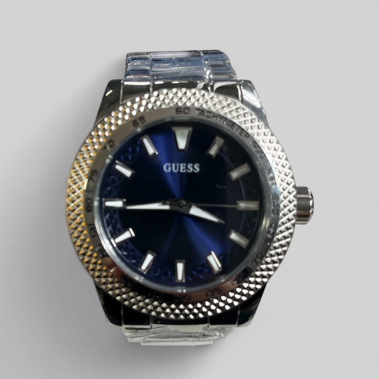 * Materiales: La caja y el brazalete suelen ser de acero inoxidable, con un revestimiento de color azul o tonos dorados y plateados. En lugar de diamantes genuinos, Guess utiliza a menudo cristales que brillan de manera similar, incrustados en el bisel (el aro alrededor de la esfera) o en la propia esfera como marcadores de hora.