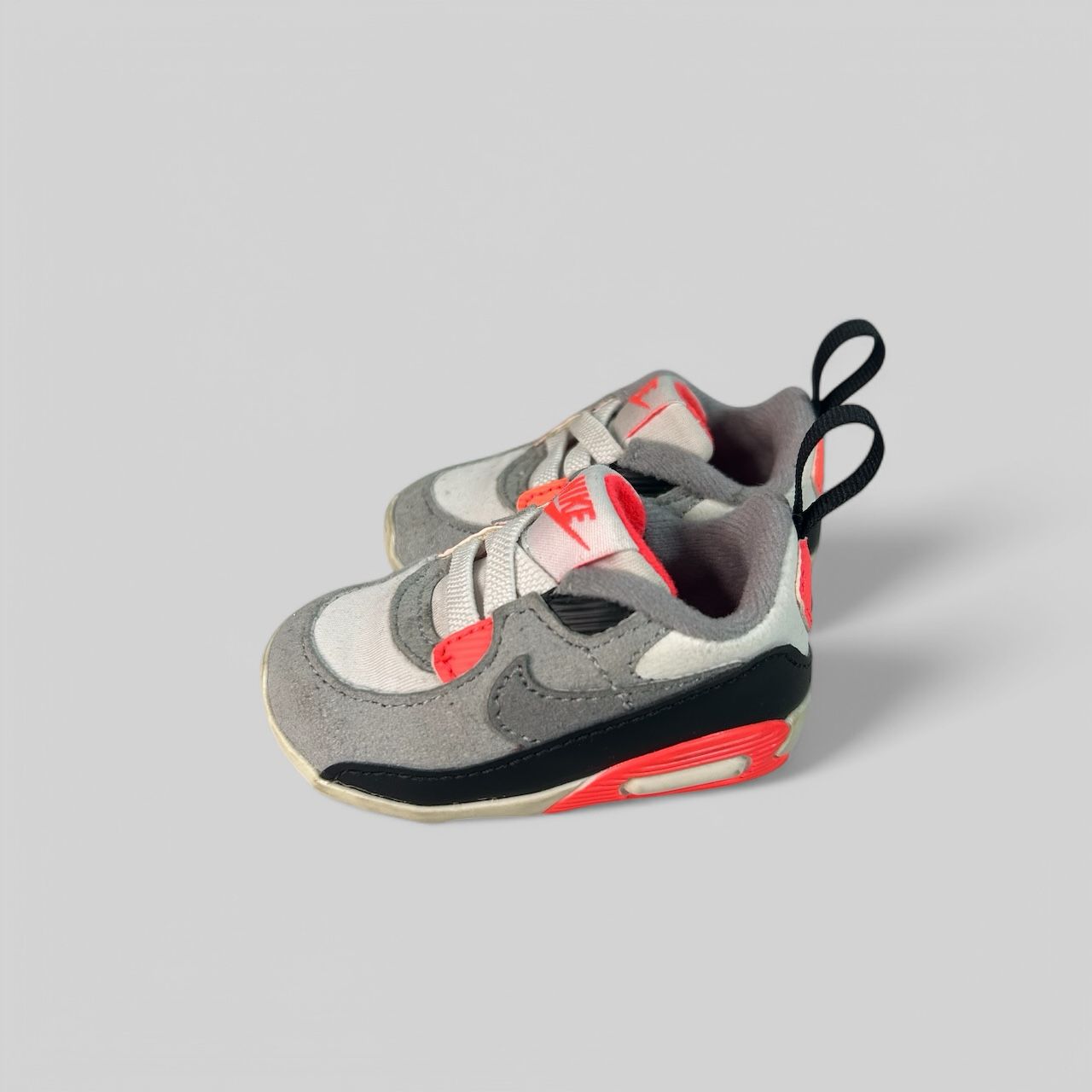🩶 Diseño Mini Air Max: versión para bebé del clásico modelo Nike, con detalles en gris, blanco, negro y toques de rojo neón.